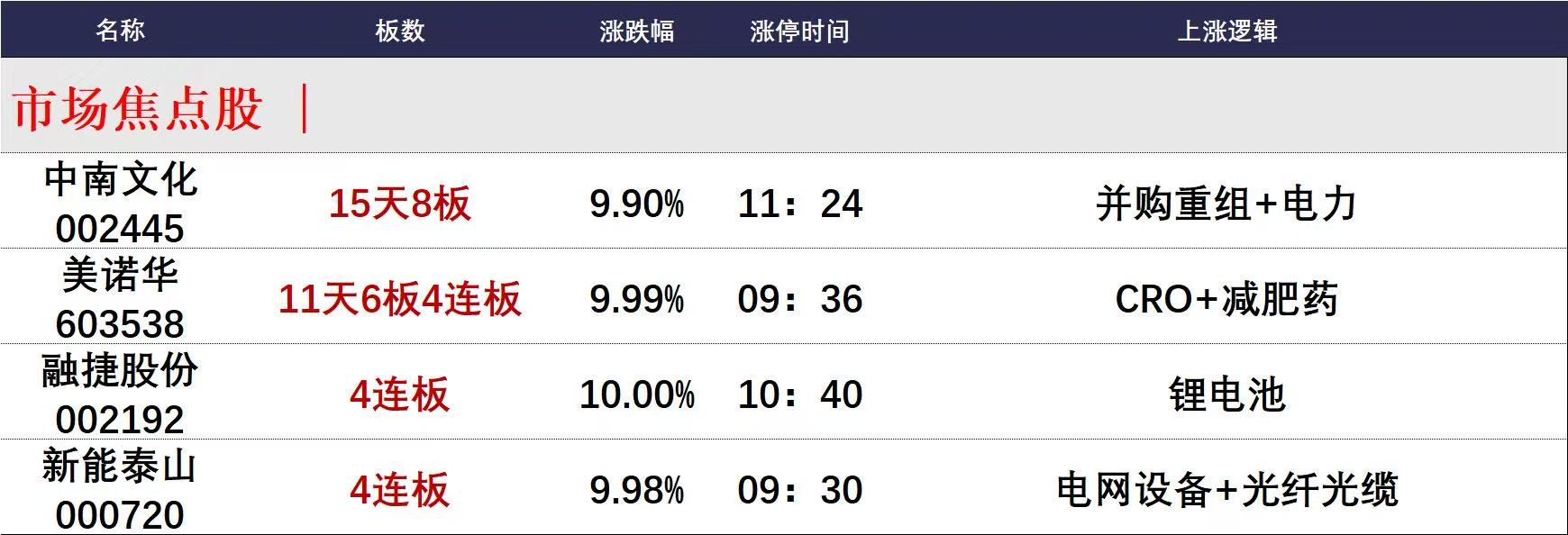 今日午盘全市场共54股涨停,连板股总数10只,11股封板未遂,封板率为83%(不含ST股、退市股)。焦点股方面,并购重组的中南文化15天8板,减肥药概念股美诺华11天6板,锂电池板块融捷股份4连板,电网设备板块新能泰山4连板。